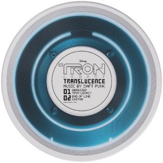The clear vinyl disc features an image of the identity disk from the Tron Legacy movie and comes in 3 different versions of the vinyl. Each will have a different colour ring around the disk – blue, yellow or red and is wrapped in clear cellophane sleeve.