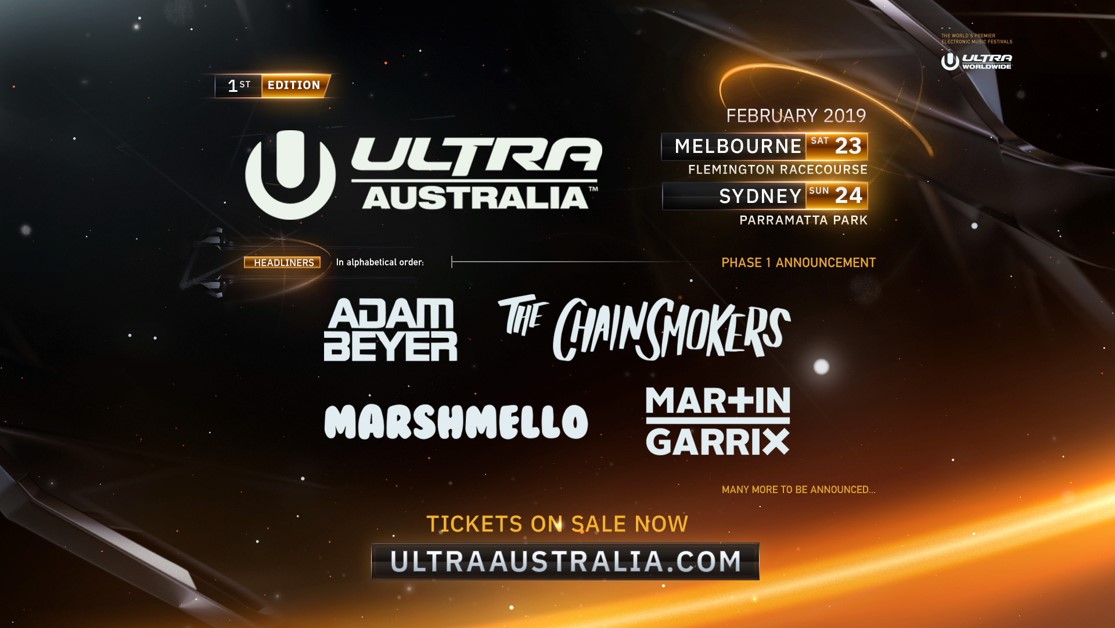 Showcasing ‘Ultra Australia’ at two of the nation’s premiere venues in: Flemington Racecourse, Melbourne & Parramatta Park, Sydney, we are also excited to announce this amazing Phase 1 Line-up and we are counting down the days til Summer.”